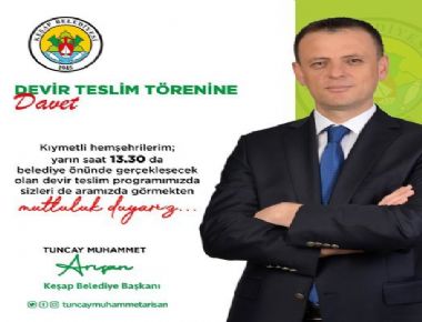 DEVİR TESLİM TÖRENİNE DAVET KIYMETLİ HEMŞEHRİLERİM; 04.04.2024 PERŞEMBE GÜNÜ SAAT 13.30 DA BELEDİYE ÖNÜNDE GERÇEKLEŞECEK OLAN DEVİR TESLİM PROGRAMIMIZDA SİZLERİ DE ARAMIZDA GÖRMEKTEN MUTLULUK DUYARIZ. TUNCAY MU...